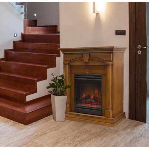 Основание электрического камина в сборе с порталом исполнено из металла - электрокамин и МДФ - портал. В комплекте идет пульт для дистанционного управления. Кроме этого, именно в этой модели есть специальный режим для регулировки яркости пламени и топки. Цвет очага - черный, в комплекте идет муляж прогоревших дров, а также термостат. Есть две ступени нагрева, декоративный режим, а также обогрев.